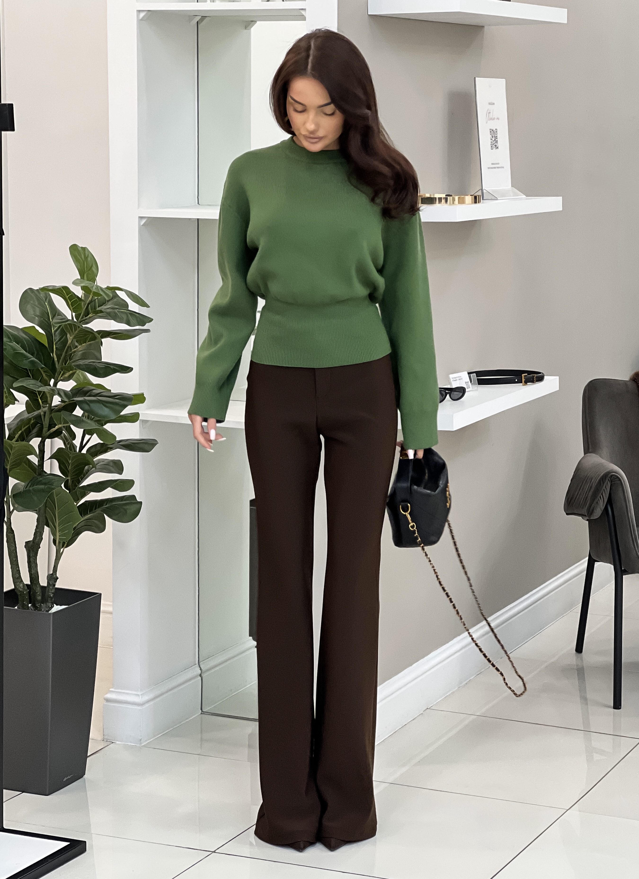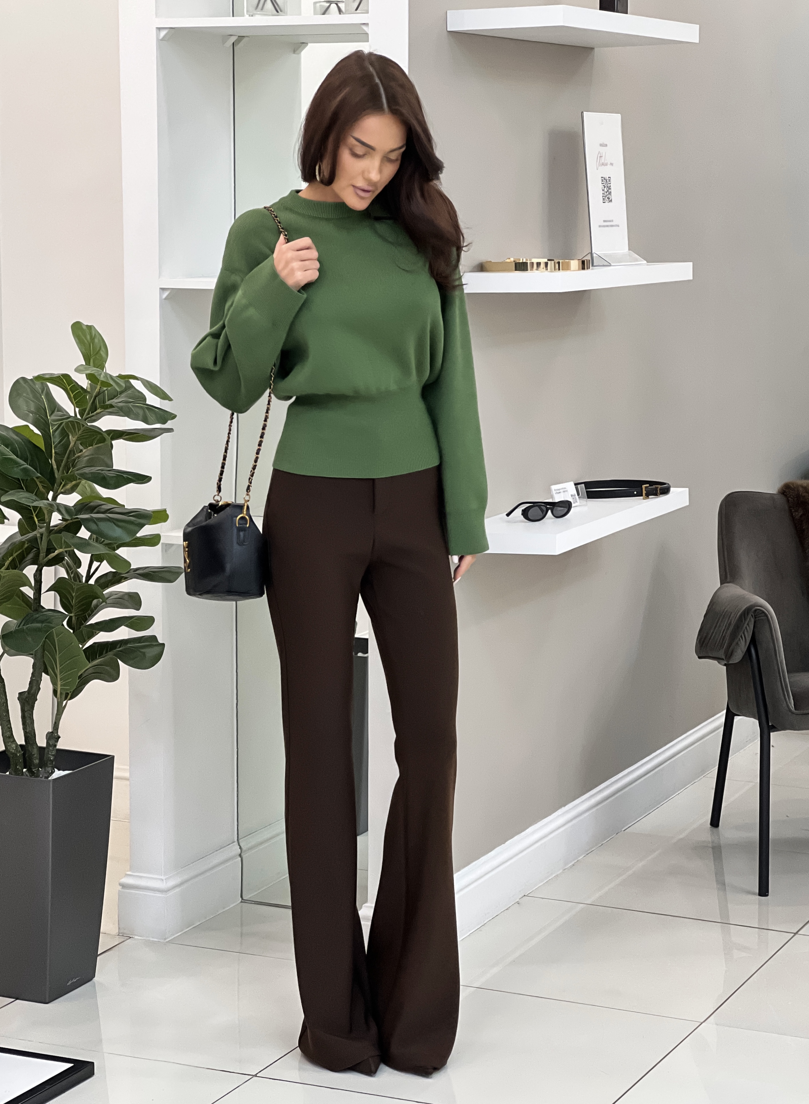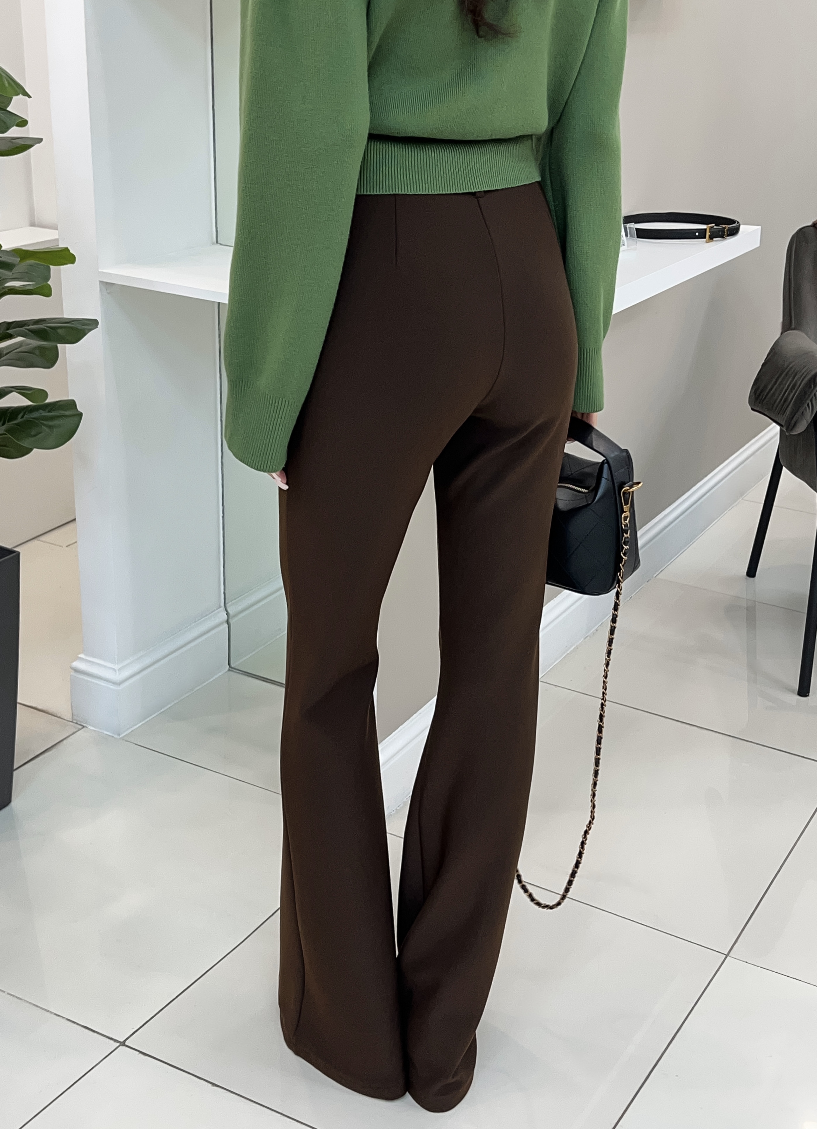 Параметры модели: рост 166 см, обхват груди 86 см, талия 61 см, обхват бедер 87 см. На модели брюки в размере S. На модели обувь на каблуке.