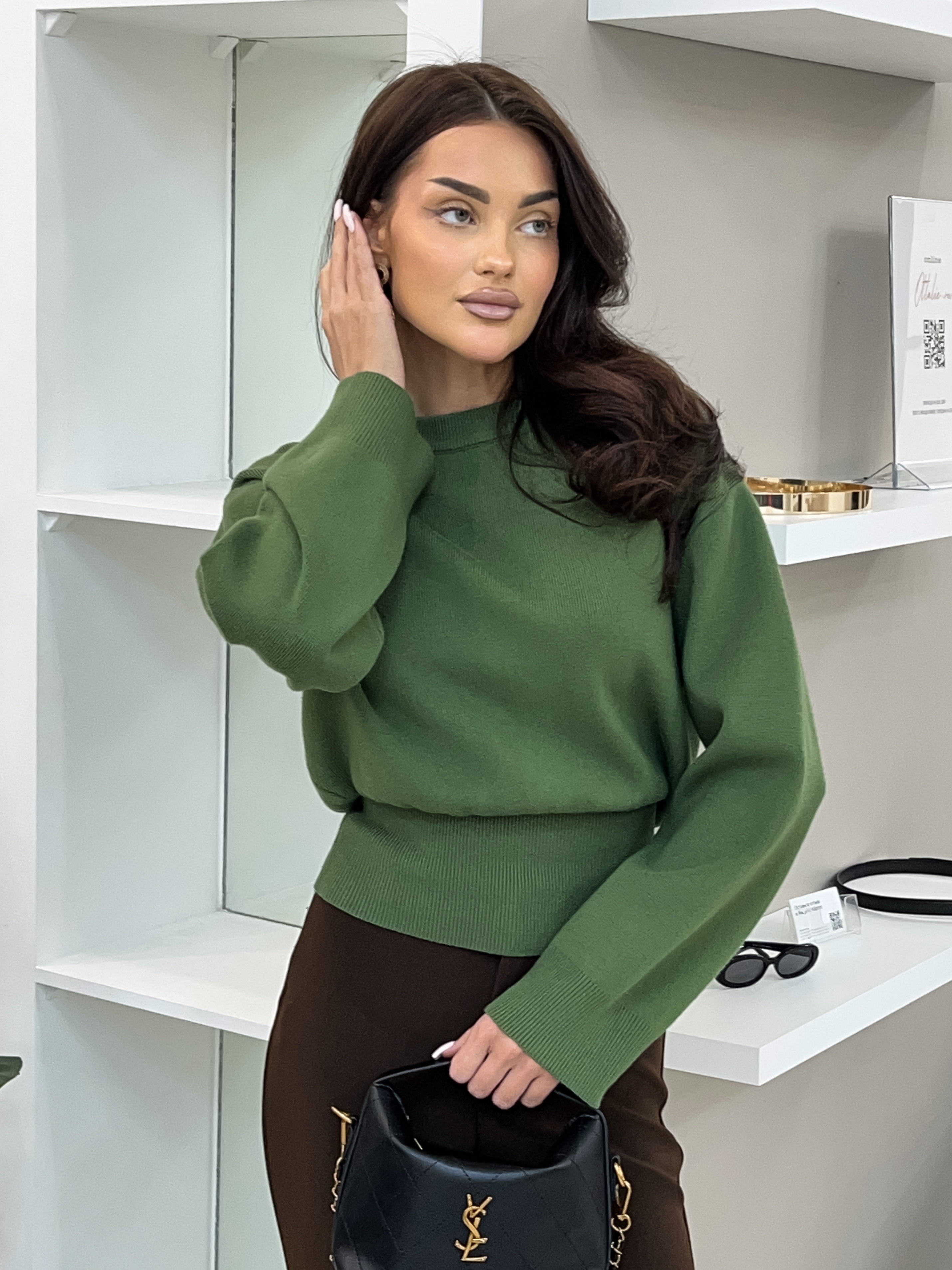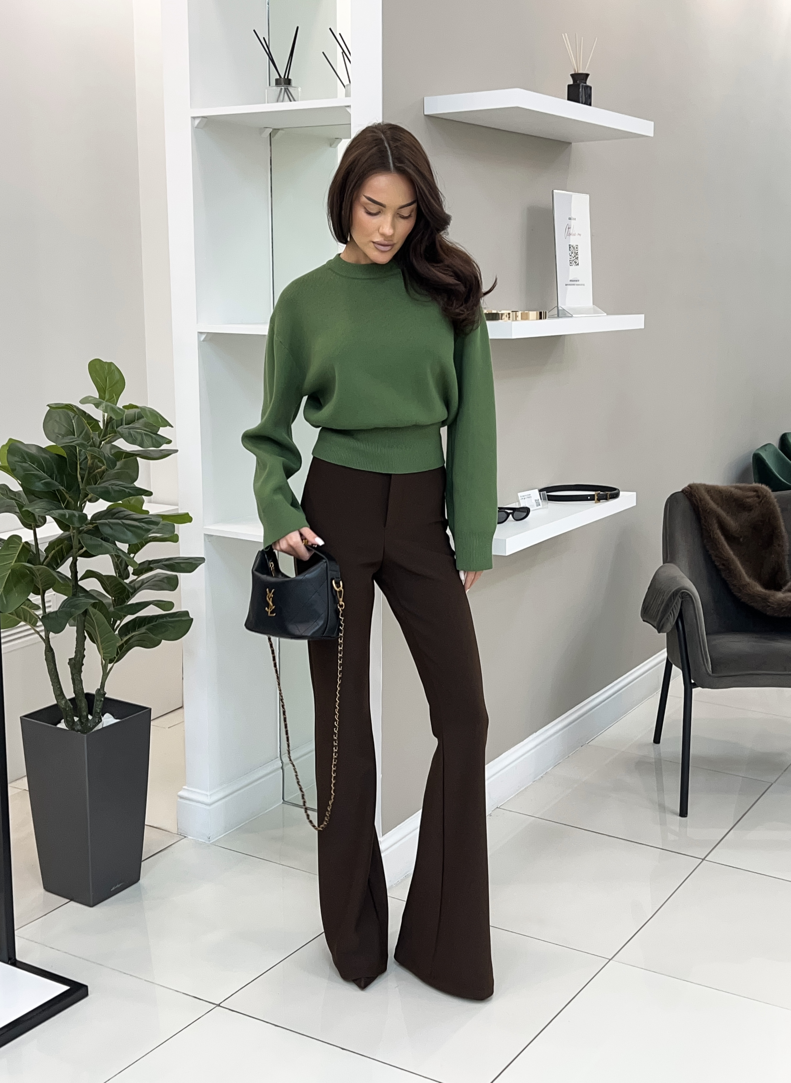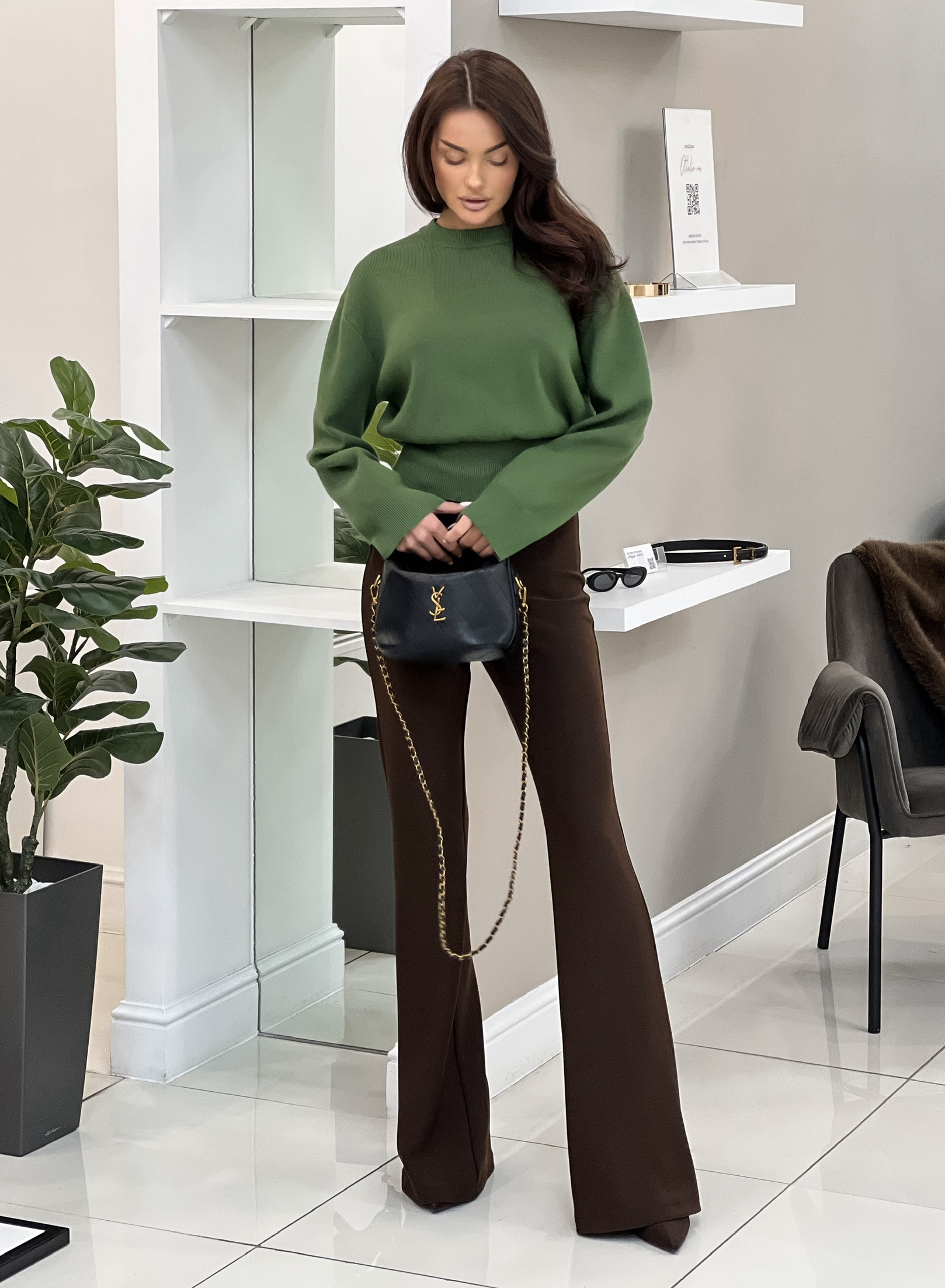 Параметры модели: рост 166 см, обхват груди 86 см, талия 61 см, обхват бедер 87 см. На модели брюки в размере S. На модели обувь на каблуке.