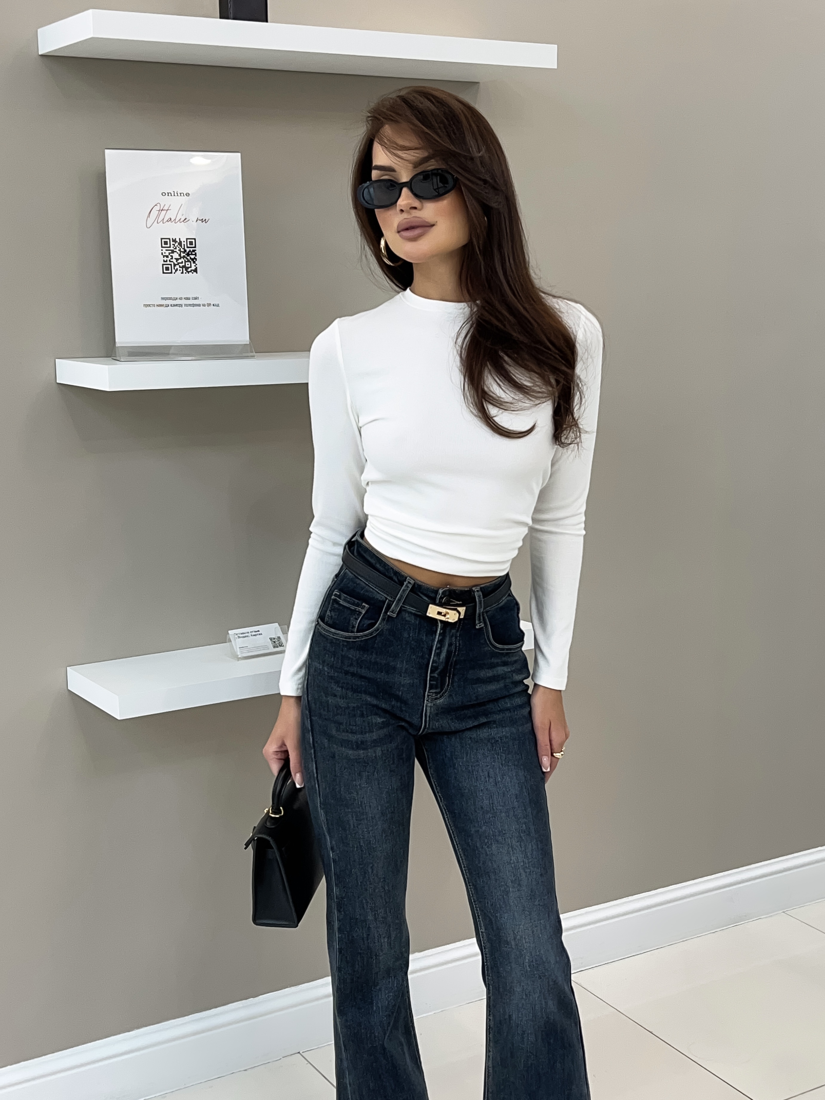 Параметры модели: рост 166 см, обхват груди 86 см, талия 61 см, обхват бедер 87 см. На модели джинсы в размере 26.