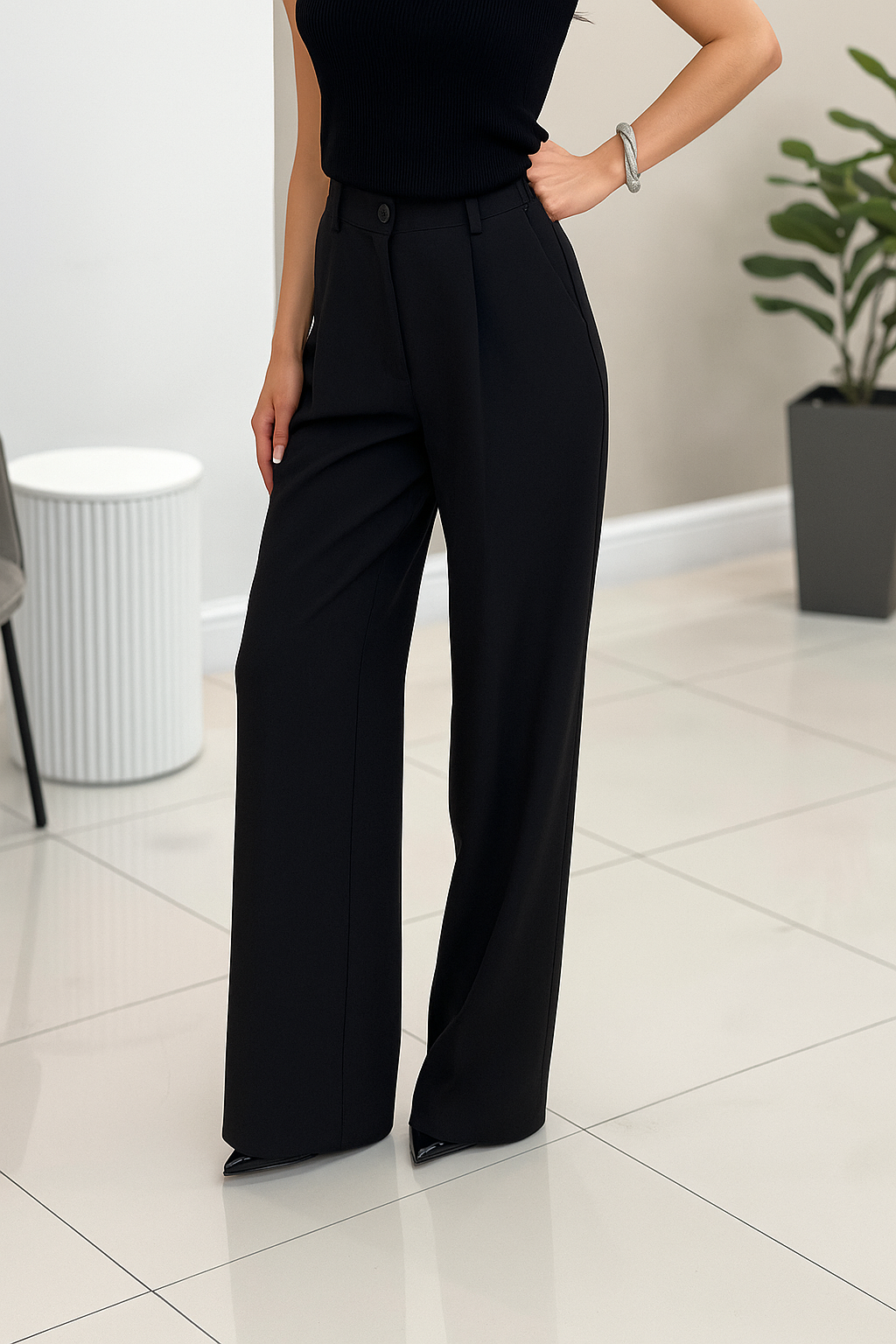 Брюки прямого кроя из смесовый костюмной ткани. Пояс с вставками резинки по бокам и с шлицами для ремня.