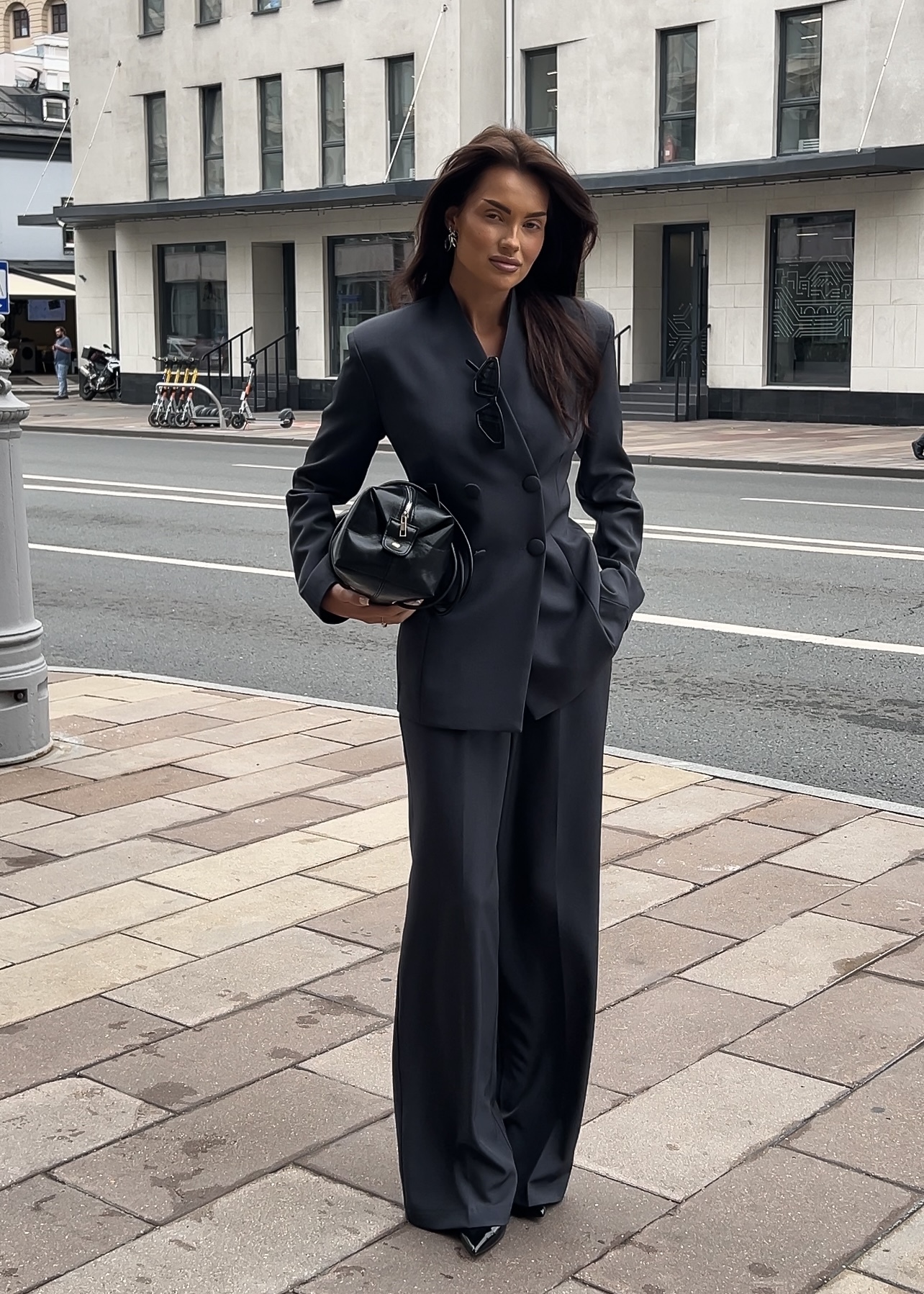 Параметры модели: ОГ 85 см, ОТ 62 см, ОБ 86 см. Рост модели 166 см. На модели костюм в размере 42.