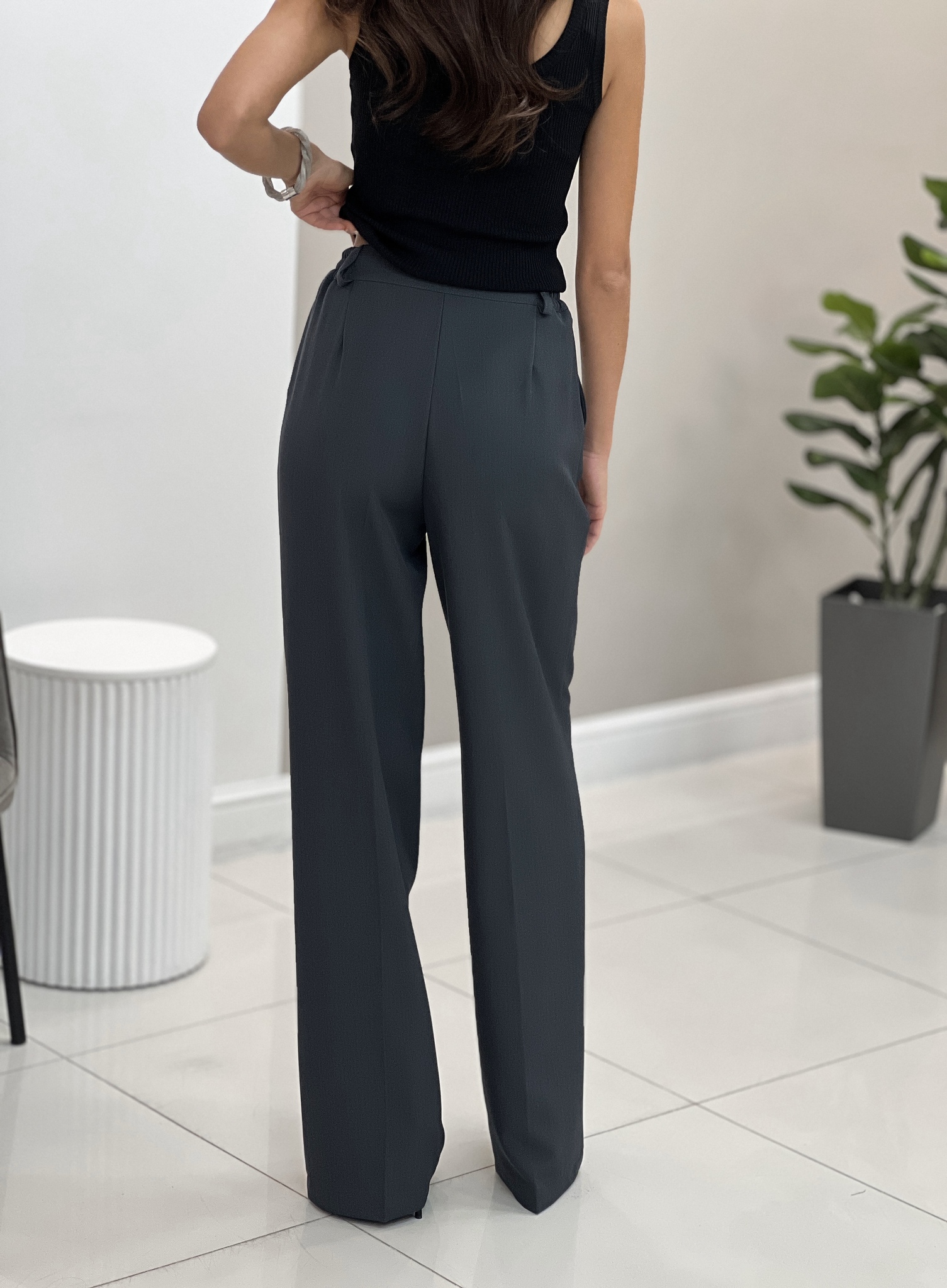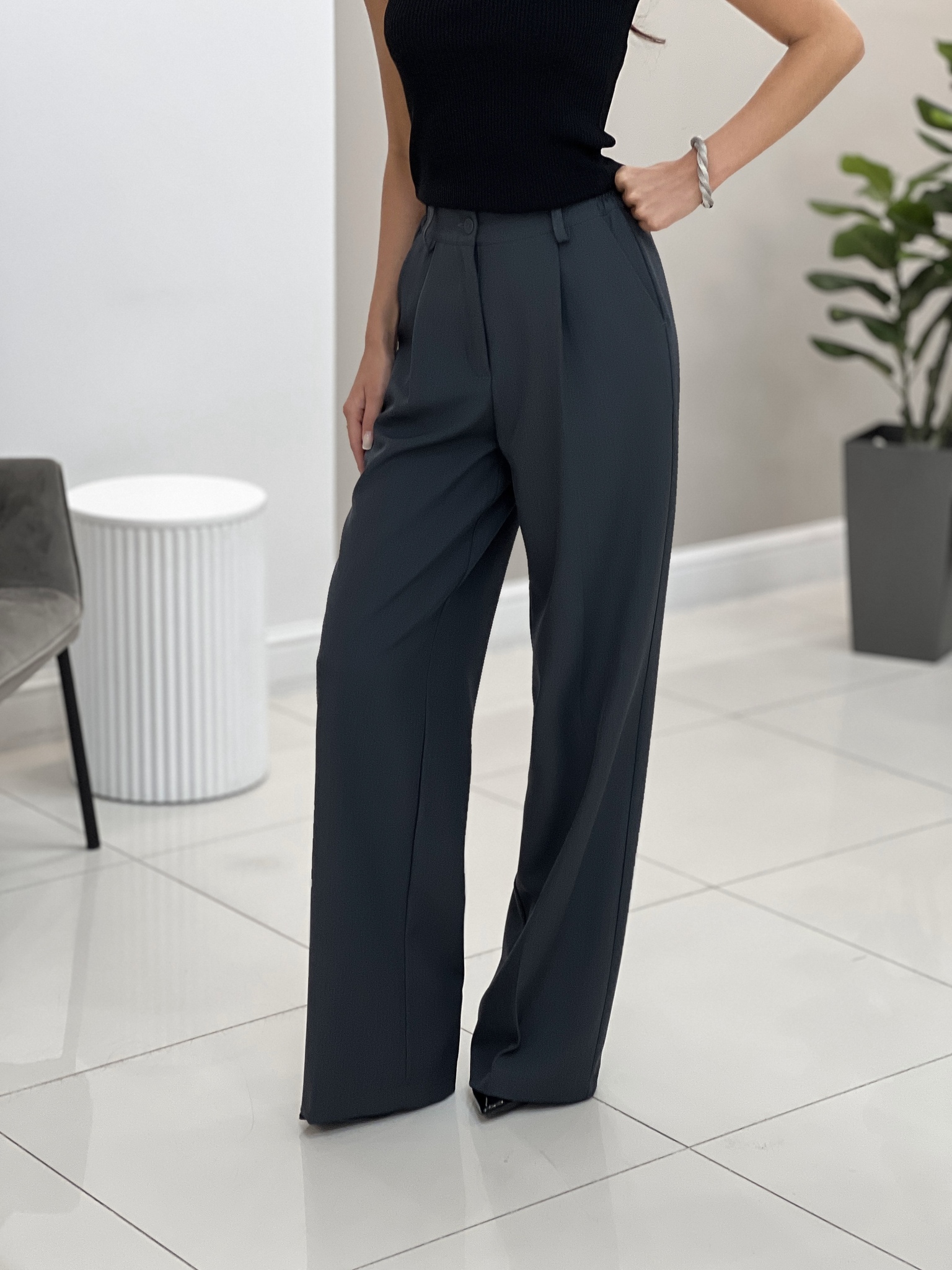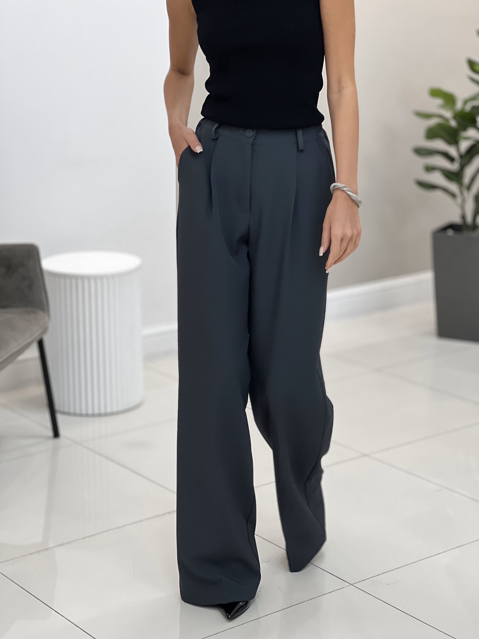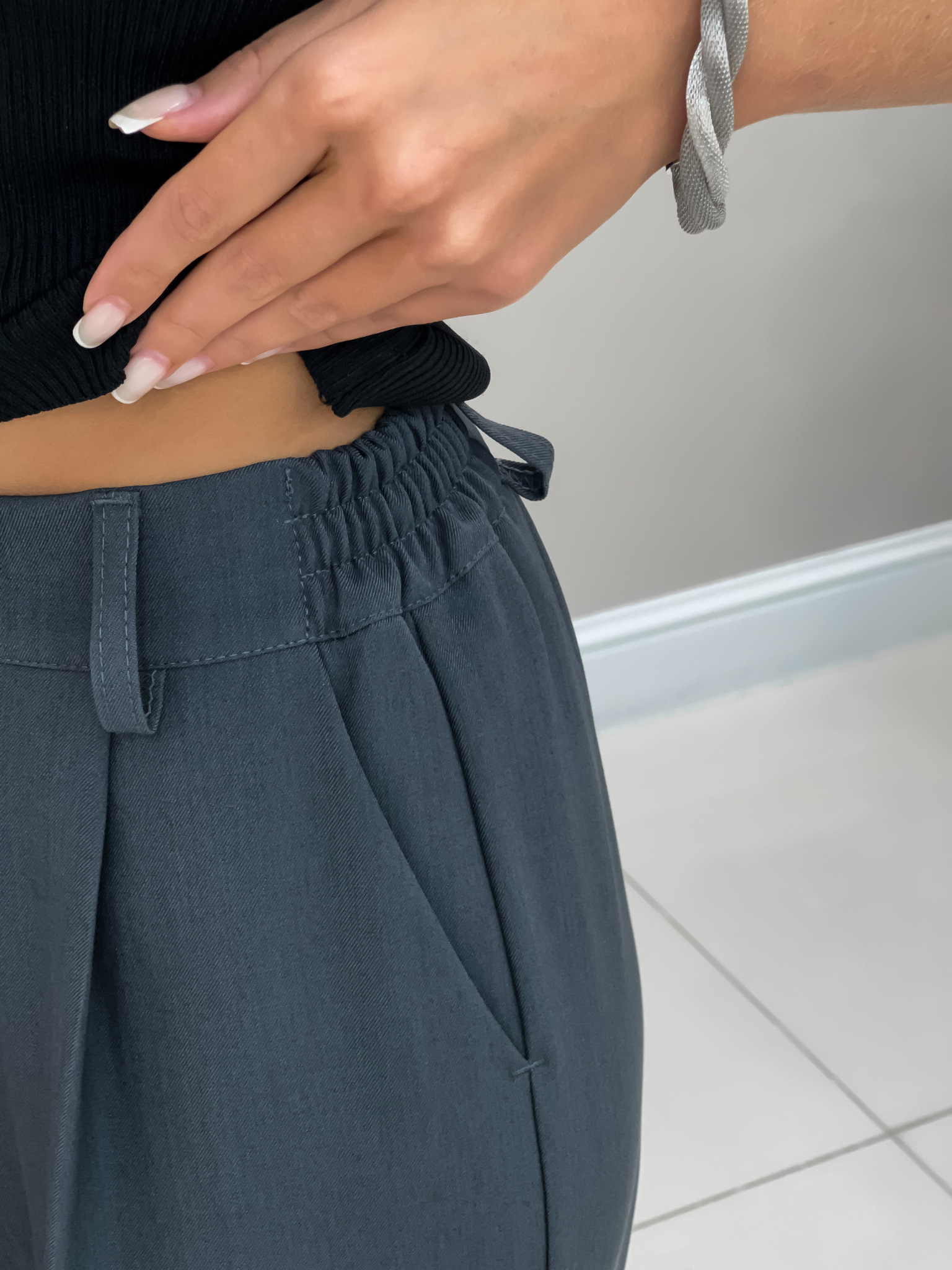 Брюки прямого кроя из смесовый костюмной ткани. Пояс с вставками резинки по бокам и с шлицами для ремня.