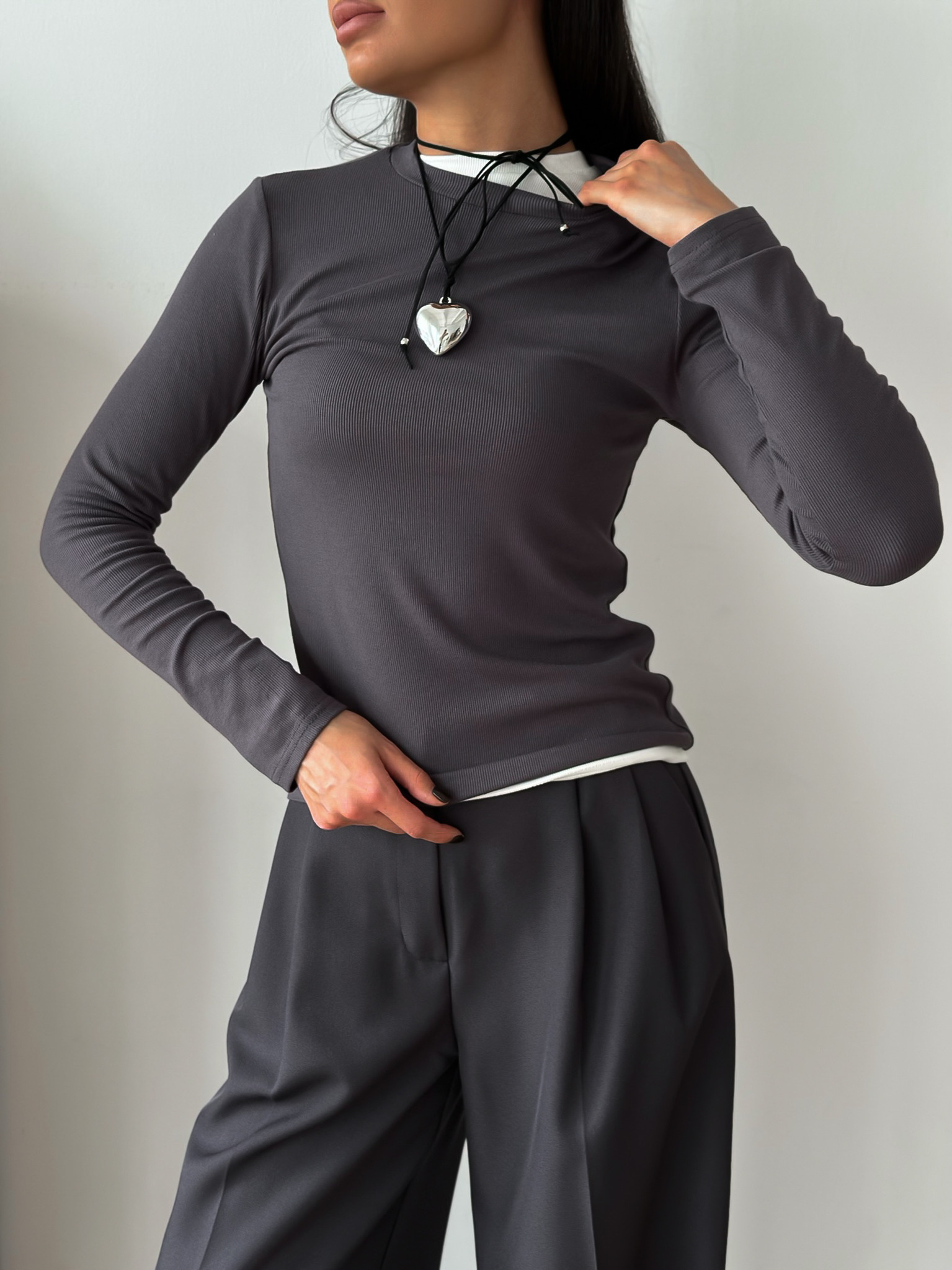 Лонгслив из смесовой ткани в рубчик. На фото графитовый лонгслив надет на белый.
