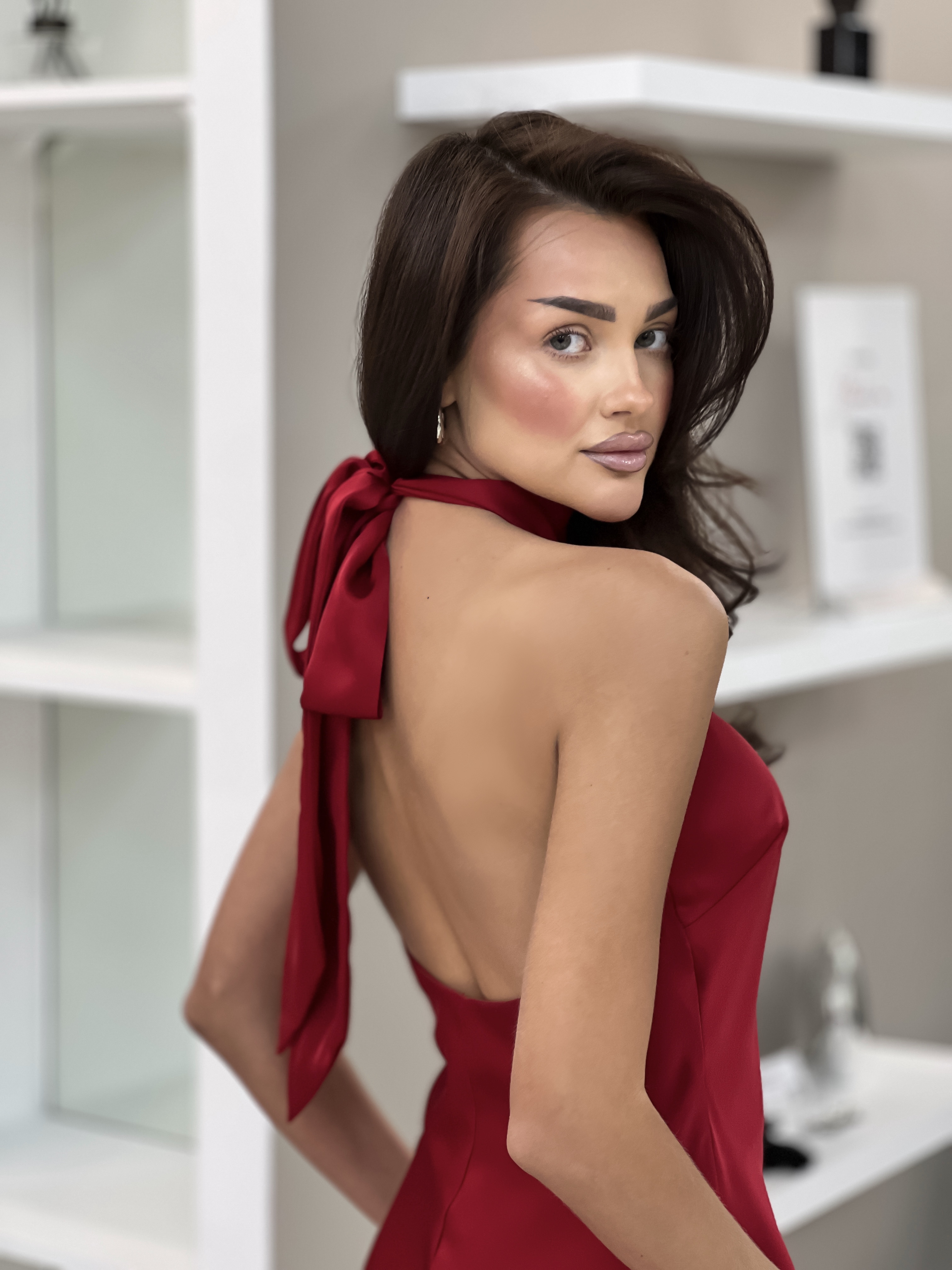 Платье из атласной ткани с американской проймой. Без застежек. Ворот-бант завязывается на спине. Спинка открытая. Фасон платья чуть приталенный, подразумевает свободную, летящую посадку. Не должно обтягивать.
